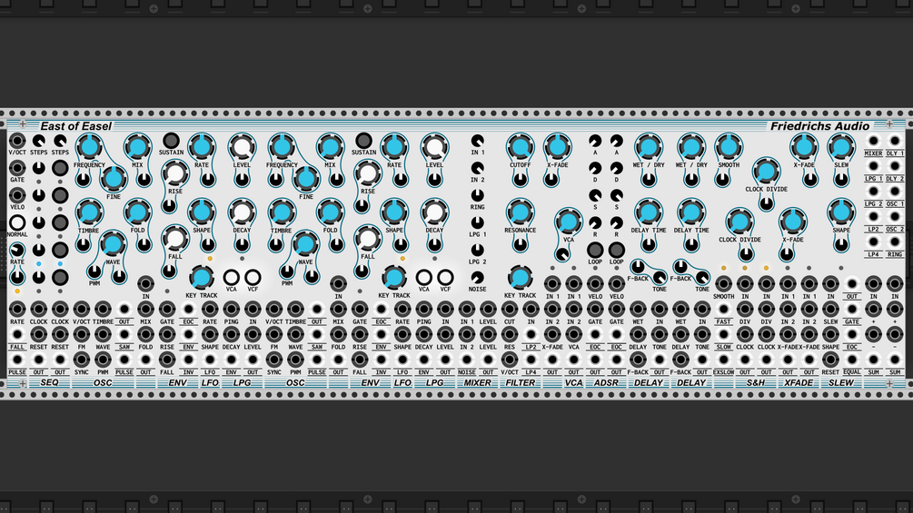 Nothing is left on the table. The oscillators feature linear and exponential FM as well PWM and wave folding. The low pass gates can be inverted in the mixer to make them high pass filters. The filter can be used as a sine wave oscillator instead of a filter thanks to its variable key tracking. The sequencer and slew can be patched together as a five stage LFO. If you can think of it, East of Easel can do it.
