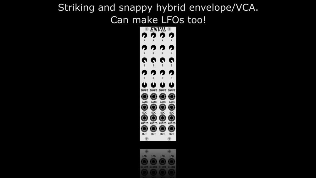 Envil is a compact East Coast modulation generator with built in audio VCAs. The ADSR envelopes can be looped by patching the EOC output to the GATE input. There is also continuous and smooth control over the shape of the envelopes all the way from logarithmic to exponential.